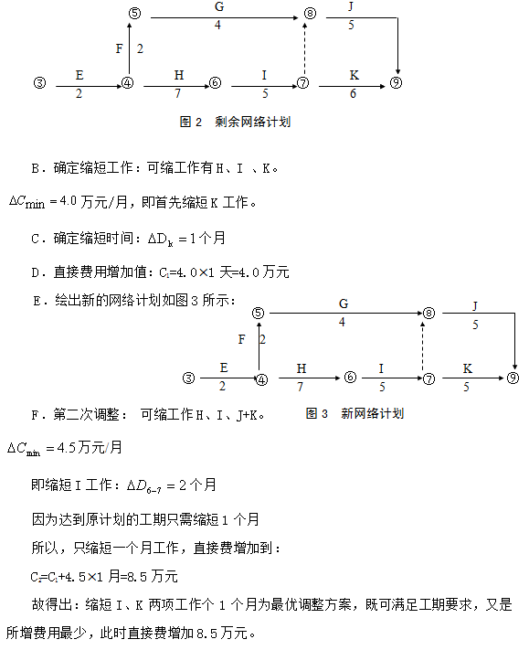 (1)计算时间参数,见图2。关键线路为①-②-③-④-⑥-⑦-⑨ 。由于E为关键工作,原计划总时差为0,所以,拖后两个月,影响工期两个月。