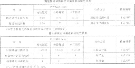 (4)管片拼装过程中对隧道轴线和高程进行控制,其允许偏差和检验方法符合下表的规定。