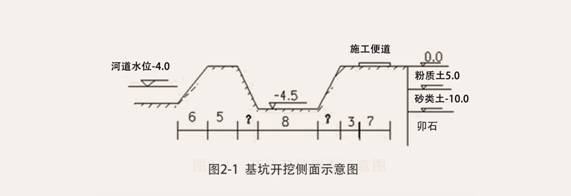 A公司承建一座桥梁工程,将跨河桥的桥台土方开挖工程分包给B公司,桥台基坑底尺寸为50*80m,深4.5m;施工期河道水位为-4.0m,基坑顶远离河道一侧设置和施工便道(用于弃土和混凝土运输及浇筑)。基坑开挖图如下: