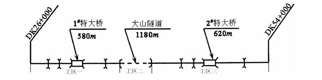 从起点DK26+000到大山隧道入口为一工区,配备路基施工一队,负责本工区路基工程,桥涵施工队一队,负责1#特大桥工程;