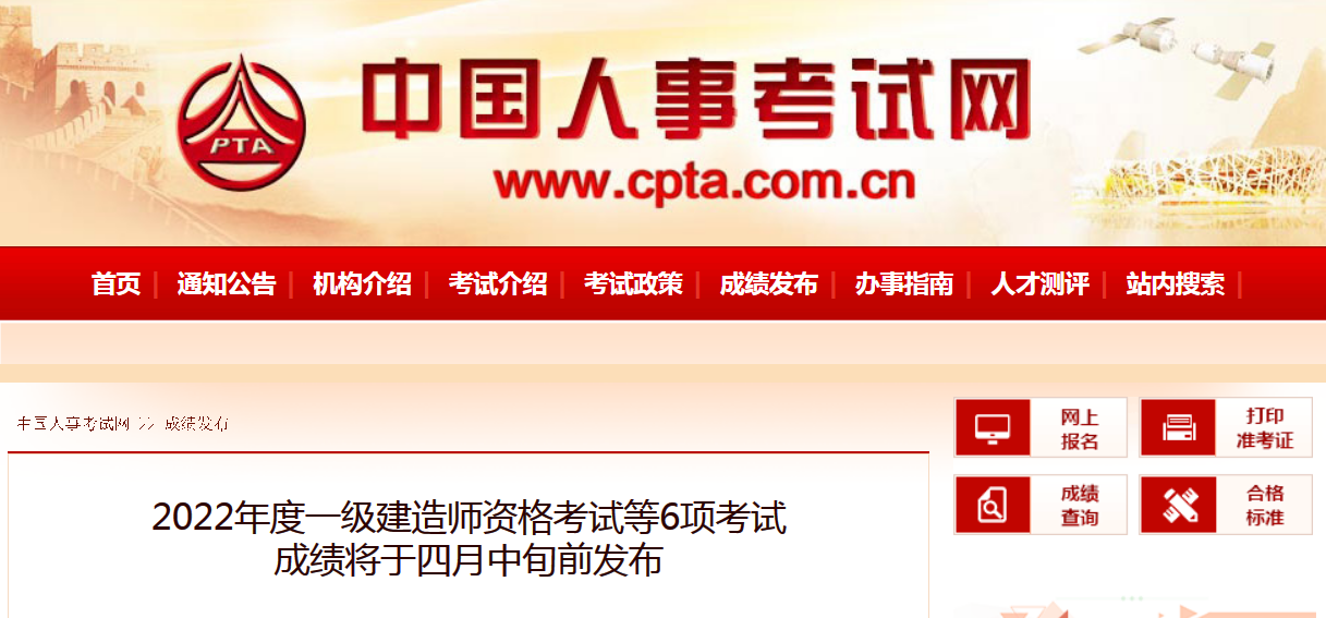 近日,中国人事考试网发布《2022年度一级建造师资格考试等6项考试成绩将于四月中旬前发布》,明确了2022年广东一建考试成绩查询时间。