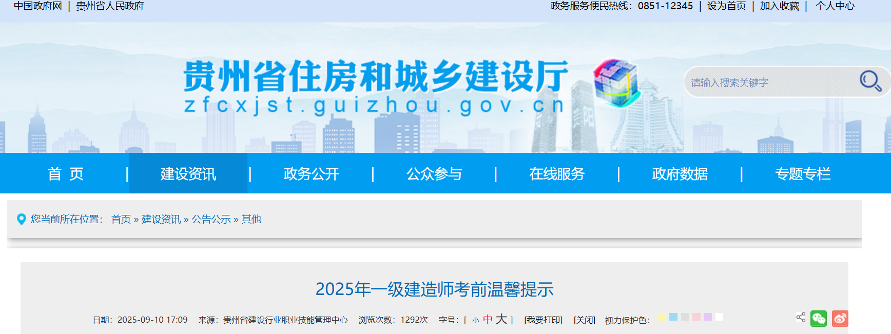贵州省住建厅提醒考生,2025年一级建造师考试准考证打印时间为9月12日至21日。考生需携带准考证和有效身份证件参加考试。考点信息详见准考证。注意准考证保持干净,考点不提供停车服务,建议提前规划出行。