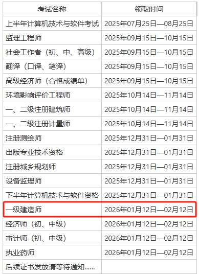 1月12日,海南就业公共服务旗舰店发布《2025年度专业技术人员职业资格考试合格证书领取通知(2026年1月12日更新)》,明确海南2025年度一级建造师证书领取时间是2026年1月12日-2月12日。