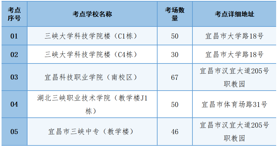 2025年度一级建造师职业资格考试(宜昌考区)参考人数7919人,共设4个考点学校5栋教学楼。请考生通过准考证准确掌握考点地址、考场号及座位号。