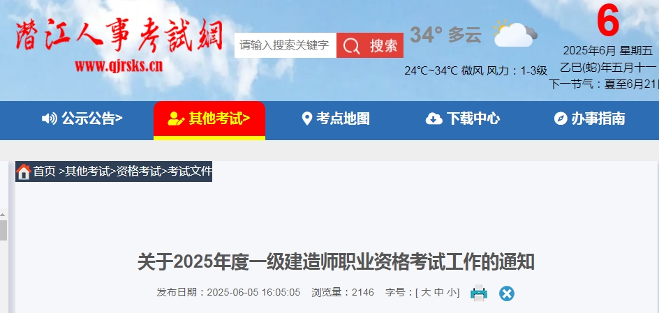 近日,潜江人事考试网发布2025年度一级建造师职业资格考试通知。考试9月20-21日举行,设4个科目。报名时间为6月12-25日,各地按属地管理原则审核。同时明确收费标准、违纪处理办法等,更多详情可查看通知原文。