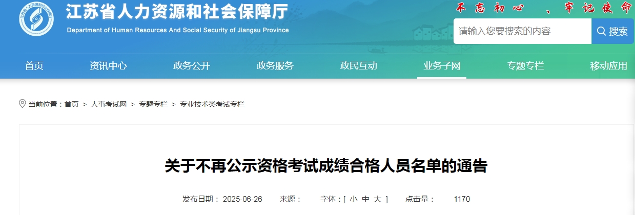 江苏省人力资源和社会保障厅发布了《关于不再公示资格考试成绩合格人员名单的通告》,自2025年6月起,我省不再对全国专业技术人员资格考试合格人员名单进行公示。