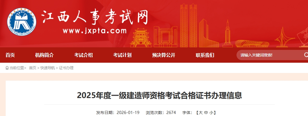 1月19日,江西人事考试网发布《2025年度一级建造师资格考试合格证书办理信息》,明确江西2025年度一级建造师证书委托邮寄取证时间是2026年1月19日开始,现场领取时间是每月的最后五个工作日。
