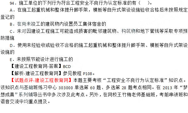 【试题点评-建设工程教育网】本题主要考核“施工安全许可制度的基本概念”知识点。该知识点与基础班练习中心306000单选第1题考点相同。在2013年“梦想成真”系列辅导丛书中多次涉及此考点。另外,在网校王竹梅老师基础班,考前串讲班和语音交流中均重点提及。