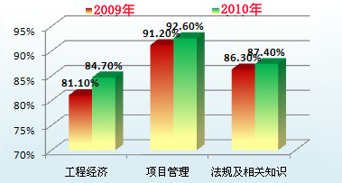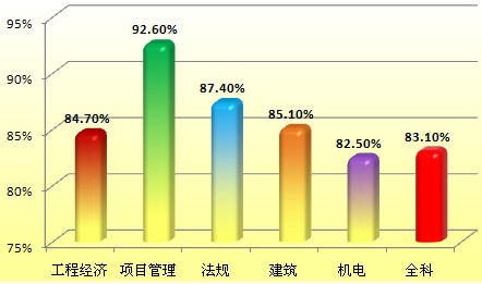 工程经济84.7%,项目管理92.6%, 法规87.4%, 建筑85.1%, 机电82.5%