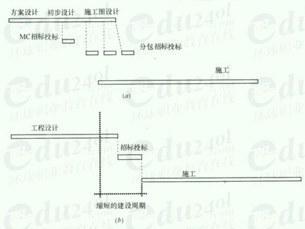 (a)建设项目施工总承包管理模式下的项目开展顺序;(b)建设项目施工总承包模式下的项目开展顺序