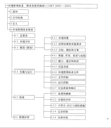 《环境管理体系要求及使用指南》(GB/T 24001--2004)的结构图如图IZ205011-4所示。该标准由“范围”、“引用标准”、“定义”和“环境管理体系要求”四部分组成。