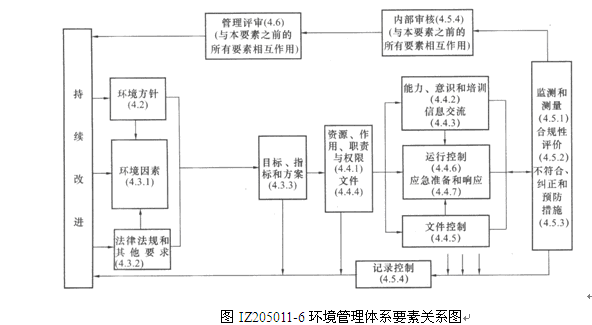 从17个要素的内容及其内在关系来看,核心要素是10个,包括:环境方针;环境因素;法律法规与其他要求;目标、指标和方案;资源、作用、职责与权限;运行控制;监测与测量;评估法规的符合性;内部审核;管理评审。其余7个要素为辅助性要素。