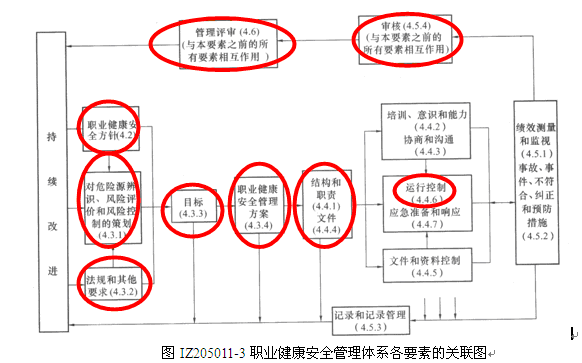 10个核心要素(体现主体框架和基本功能)包括:职业健康安全方针;对危险源辨识、风险评价和风险控制的策划;法规和其他要求;目标;结构和职责;职业健康安全管理方案;运行控制;绩效测量和监视;审核;管理评审。