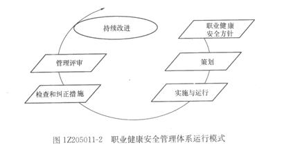 《职业健康安全管理体系规范》(GB/T 28001-2001)强调按系统理论管理职业健康安全及其相关事务,以达到预防和减少生产事故和劳动疾病的目的。具体采用了系统化的戴明模型,即一个动态循环并螺旋上升的系统化管理模式。职业健康安全管理体系运行模式如图IZ205011-2所示。