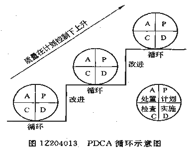 PDCA循环(图1Z204013),是人们在管理实践中形成的基本理论方法。从实践论的角度看,管理就是确定任务目标,并按照PDCA循环原理来实现预期目标。由此可见PDCA是目标控制的基本方法。