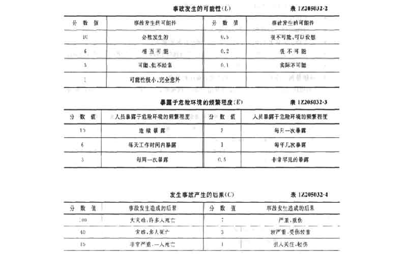 将可能造成安全风险的大小用事故发生的可能性(L)、人员暴露于危险环境中的频繁程度(E)和事故后果(C)三个自变量的乘积衡量,即: