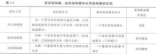 4.项目结构图、组织结构图和合同结构图的区别项目结构图、组织结构图和合同结构图的区别见表1—1。
