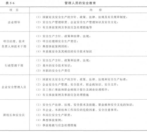 企业领导的安全教育;项目经理、技术负责人和技术干部的安全教育;班组长和安全员的安全教育;特种作业的范围;企业(公司)级安全教育由企业主管领导负责;安全思想、安全态度教育。