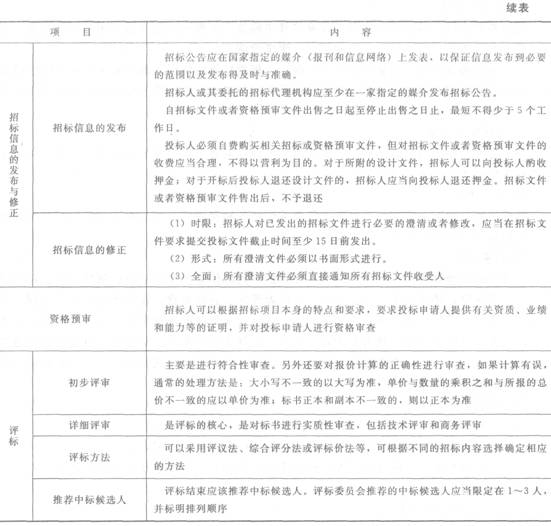 公开招标;邀请招标;自行招标与委托招标;招标信息的发布;招标信息的修正;资格预审;初步评审;详细评审;评标方法;投标者须知、合同条款、设计图纸、工厂范围及工程量表;市场宏观经济环境调查;现场考察;工程所在地区的环境考察;业主方和竞争对手公司的调查;复核工程量;技术负责人主持制定;预先确定施工方案和施工进度;以信誉取胜、以低价取胜、以缩短工期取胜、以改进设计取胜或者以现金或特殊的施工方案取胜;投标人在招标截止日之前;签章、密封。