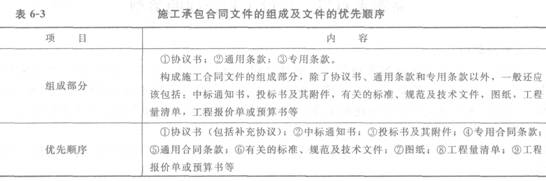 施工承包合同文件的组成及文件的优先顺序见表6-3。
