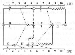 83.某分部工程时标网络计划如下图所示,检查实际进度如图中前锋线所示,该图表明( )。