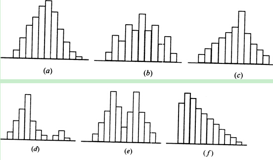 (3)异常直方图呈偏态分布,常见的异常直方图有折齿型、缓坡型、孤岛型、双峰型、峭壁型,如图1Z204064-2(b)、(c)、(d)、(e)、(f)所示,出现异常的原因可能是生产过程存在影响质量的系统因素,或收集整理数据制作直方图的方法不当所致,要具体分析。