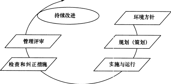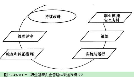 图1Z205011-4所示给出了环境管理体系的运行模式,该模式为环境管理体系提供了一套系统化的方法,指导其组织合理有效地推行其环境管理工作。该模式是由“策划、实施、检查、评审和改进”构成的动态循环过程,与戴明的PDCA循环模式是一致的。