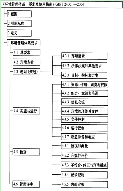 《环境管理体系要求及使用指南:》GB/T 24001m2004的结构如图1Z205011-3所示。该标准由“范围”、“引用标准”、“定义”和“环境管理体系要求”四部分组成。 “范围”中指出,本标准旨在其所有的要求都能纳入任何一个环境管理体系。其应用程度取决于诸如组织的环境方针、活动、产品和服务的性质、运行场所的条件等因素。 “环境管理体系要求”指出了管理体系的全部具体内容。