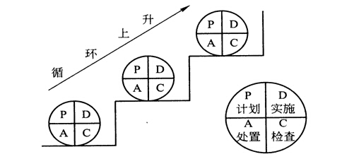 PDCA循环是建立质量管理体系和进行质量管理的基本方法。 PDCA循环如右图所示。从某种意义上说,管理就是确定任务目标,并通过PDCA循环来实现预期目标。每一循环都围绕着实现预期的目标,进行计划、实施、检查和处置活动,随着对存在问题的解决和改进,在一次一次的滚动循环中逐步上升,不断增强质量管理能力,不断提高质量水平。每一个循环的四大职能活动相互联系,共同构成了质量管理的系统过程。