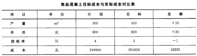 某施工项目经理部在某工程施工过程中,将标准层的商品混凝土的实际成本、目标成本情况进行比较,数据见下表: