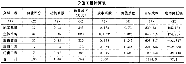 (4)从上述结果看出;主体结构、地基基础的价值系数小于1.0,因此应以主体结构、地基基础为价值工程的分析对象,寻求降低成本的措施、方法。