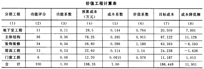 (3)由上表中可以看出:地下室工程、主体结构、门窗工程的价值系数均小于1.0,应作为价值改进对象。根据成本降低额的大小,功能改进顺序依次为:主体结构、地下室工程、门窗工程、屋面工程、装饰装修工程。