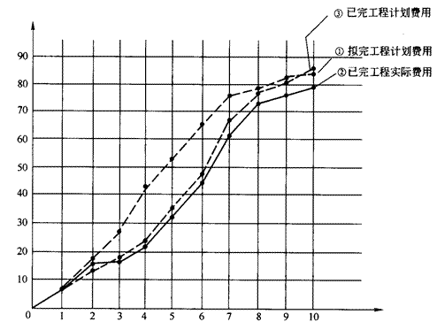 (2)绘制该工程三种投资曲线,如下图所示。图中:①拟完工程计划投资曲线;②已完工程实际投资曲线;③已完工程计划投资曲线。