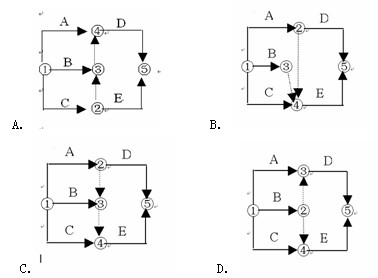 25.某双代号网络图有A、B、C、D、E五项工作,A、B完成后D才能开始,B、C完成后E开始。试选择正确的图形( )。