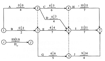 【解析】TF1_=min{4-2-0,6-2-0}d=2d,FF1—3=(4-2-0)d=2d,因此选项A正确;TF2—6=(11-4-4)d=3d,FF2—6=(11-4-4)d=3d,因此选项B正确;关键线路为①→②→③→⑥→⑦,关键工作为工作1—2、工作3—6、工作6—7,因此选项C错误;TF3—5=min{(14-5-4),(11-5-4)}d=2d,FF3—5=min{11-5-4,9-5-4}d=Od,因此选项D正确;TF5—7=(18-4-9)d=5d,FF5—7=(18-4-9)d=5d,因此选项E正确。