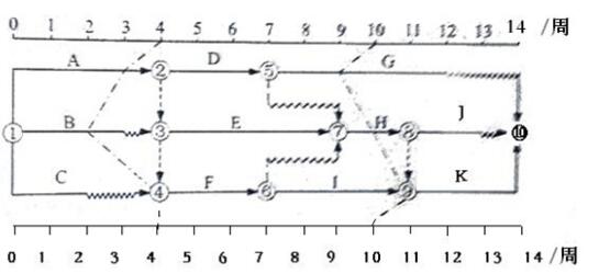 1、下图所示的双代号时标网络计划,执行到第4周末及第10周末时,检查其实际进度图中前锋线所示,检查结果表时( )。