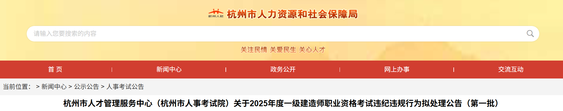 从杭州市人力资源和社会保障局获悉,杭州市2025年一级建造师考试违纪违规行为拟处理公告(第一批)已发布,涉及24人,详情如下。