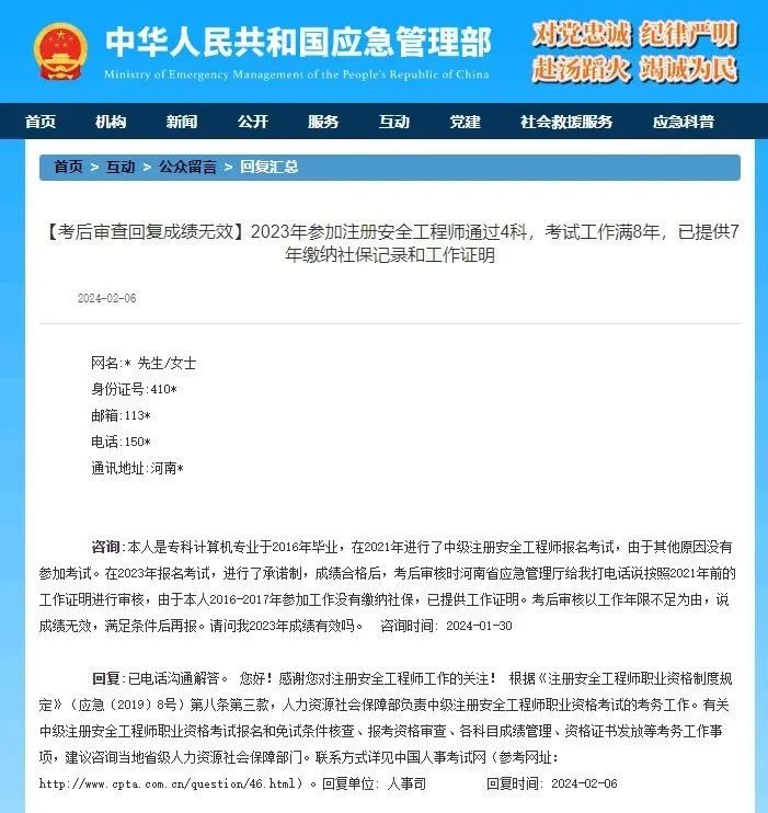 有位注安考试的考生,在官网留言,称自己是2016年计算机专业毕业,因为是非本专业报考,需满足6年的工作经验要求,在21年他报名了考试,此时工作年限不符合要求,但他并未参加此次考试,随后在满足工作年限之后,再次报名并通过了考试,考后审核却说要按照2021年前的工作证明进行审核,以工作年限不足为由,被判定为成绩无效!