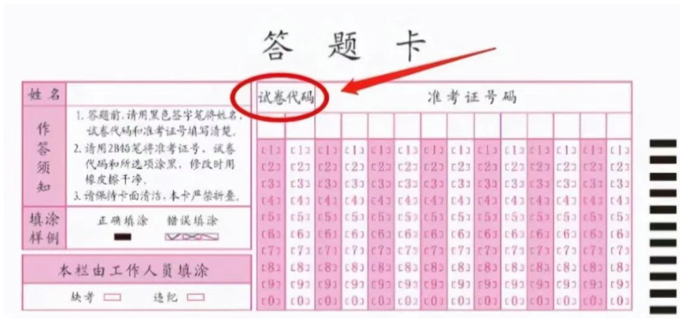 应试人员须使用黑色墨水笔在相应位置或区域认真填写姓名、准考证号、试卷代码(如需填写),并使用正规2B铅笔按规范填涂样式填涂对应信息点并进行检查,确保信息完整、准确。