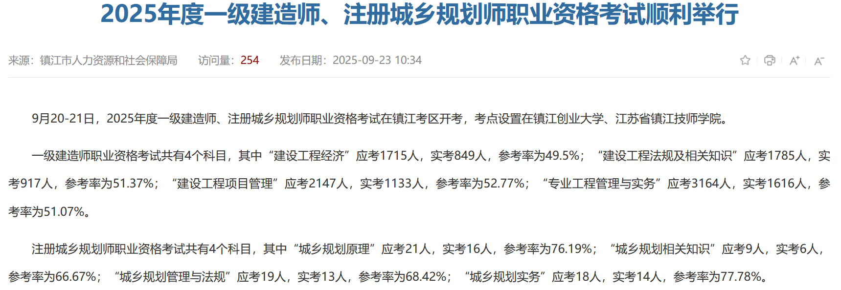 根据镇江市人力资源和社会保障局发布的2025年一级建造师考试数据,4个科目的缺考率都在50%左右。