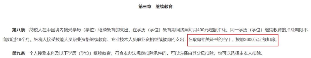 根据《个人所得税专项附加扣除暂行办法》,持证者申请“继续教育专项附加扣除”,将按照3600元定额扣除。