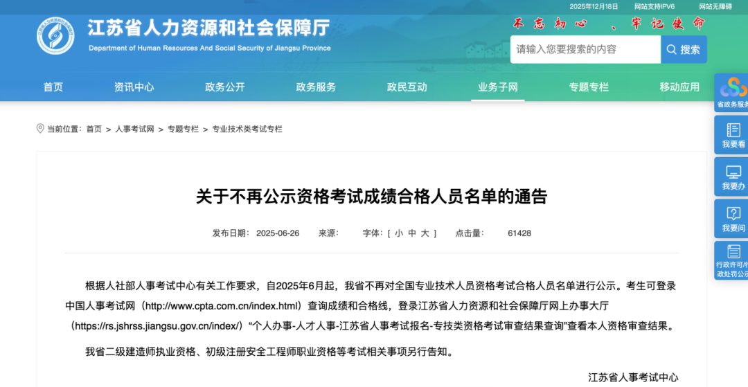 在此前,全国专业技术人员资格考试合格名单通常会向社会公示,但今年出现政策调整:江苏、广东、甘肃、广西四地已先后发布公告,明确今后不再对全国专业技术人员资格考试的合格人员名单进行社会公示。