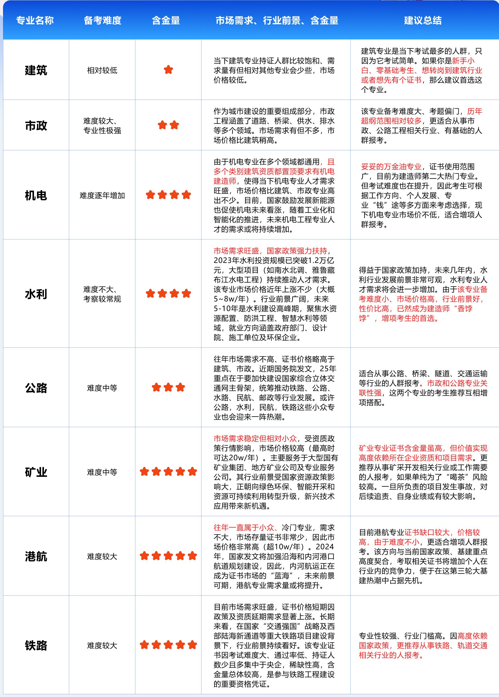 选择建议:如果你是零基础小白,建议从建筑开始,先拿证再增项。如果你有相关专业背景或工作经验,挑战高难度高回报的专业是更优选择。